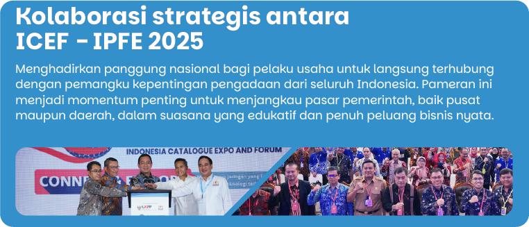 Untuk pertama kalinya, Indonesia Catalogue Expo and Forum (ICEF) berkolaborasi dengan Indonesia Procurement Forum & Expo (IPFE) dalam satu platform strategis yang akan diselenggarakan pada 30 Juli – 1 Agustus 2025 di JIExpo Kemayoran, Jakarta. Kolaborasi ini menyatukan kekuatan LKPP, KADIN, dan IAPI guna merespons kebutuhan pengadaan pemerintah yang semakin berkembang, sekaligus mendorong digitalisasi, transparansi, dan pemanfaatan produk dalam negeri.
